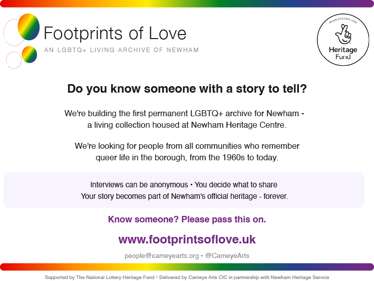 Footprints of Love is a major community storytelling project preserving the LGBTQ+ history of Newham – through oral histories, walking tours, film, and a living digital archive that belongs to the community itself.